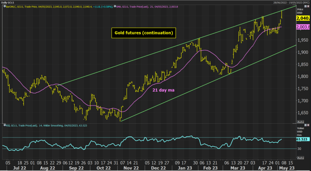 The prospect of recession in the US, lower US interest rates and slowly falling inflation supports further gains. There is good support for a pullback towards $2000/$2005 (also the 21-day moving average).