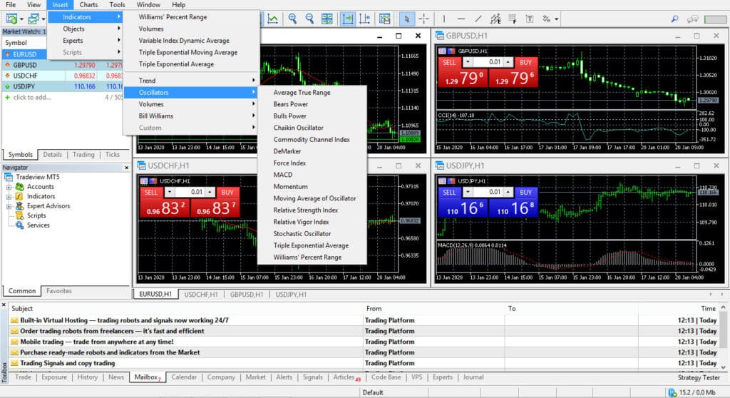 – MT5 comes with its fair share of interesting features. The MetaTrader market lets users buy custom technical indicators and expert advisors. Renting is an option as well. Copy-trading and Forex trading signals are available through MT5 too. The Strategy Tester serves as a sandbox for various trading robots and optimization modes.