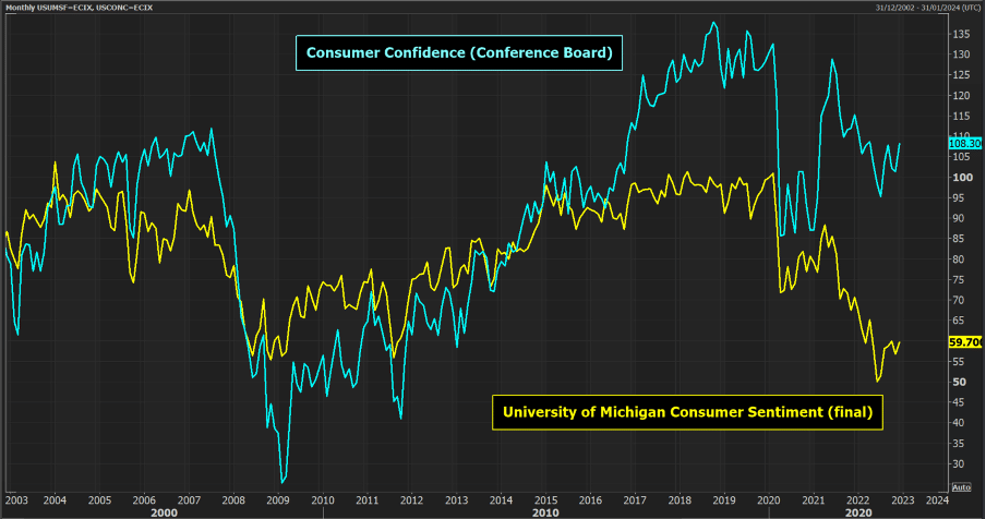 The main caveat to the US Consumer Confidence and Michigan Sentiment is the sample size. With a US population of over 330 million people, 75% of which are over the age of 18 (c. 210 million), it is a huge and diverse country (both geographically and socioeconomically). The small sample sizes of just 3000 and 500 people respectively have the potential to throw up erroneous data.