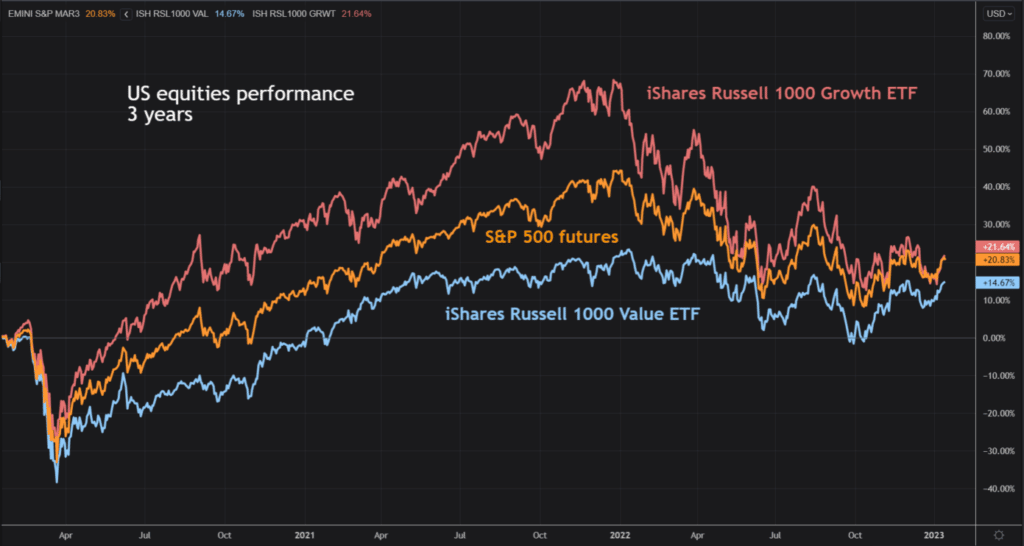 To reflect this, we show the performance of value stocks versus growth stocks in the US during the three years between 2020 and 2023.